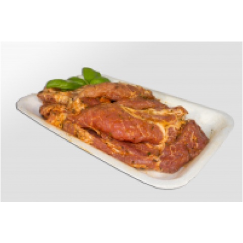 Wyrób mięsny surowy. Karkówka wieprzowa bez kości z dodatkiem wody, przypraw i oleju pokrojona w plastry.