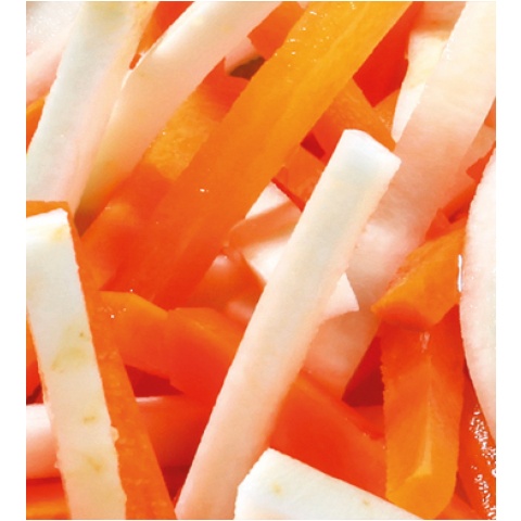 warzywa (marchew paski, seler paski, por plastry, pietruszka paski) w zmiennych proporcjach