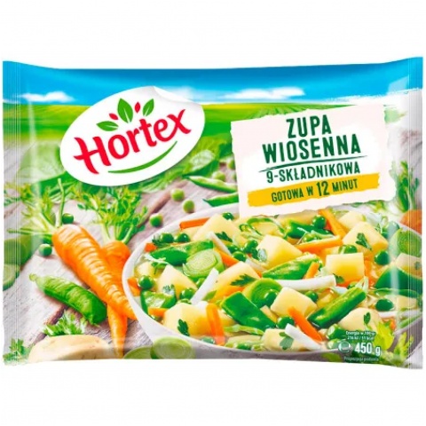 kompozycja starannie dobranych i wyselekcjonowanych składników takich jak ziemniaki, groch zielony, fasola szparagowa płaskostrąkowa, marchew, kapusta biała, seler, por, pietruszka, natka pietruszki. Propozycja, dzięki której możomy mieć odbobinę wiosny na talerzu o każdej porze roku.